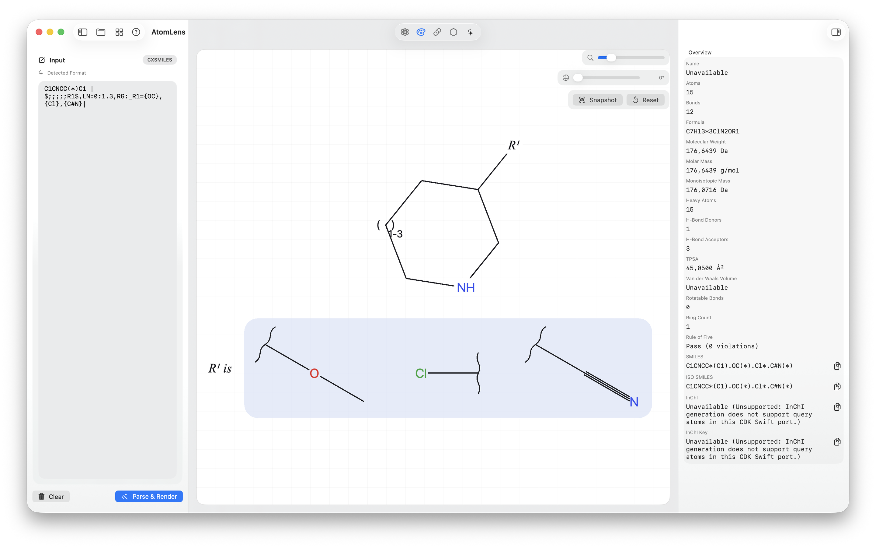 - Inspect advanced chemistry notation such as supported Markush R-groups, imported highlights, and reaction-aware CML input.